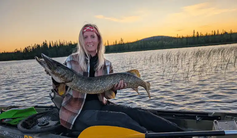 Kajakangeln auf Hecht, Barsch, Äsche, Forelle – inkl. Guiding & Workshops, Angelkajak, Verpflegung, Übernachtung in einer urgemütlichen Lodge mit Sauna, Local Food & Flughafentransfer